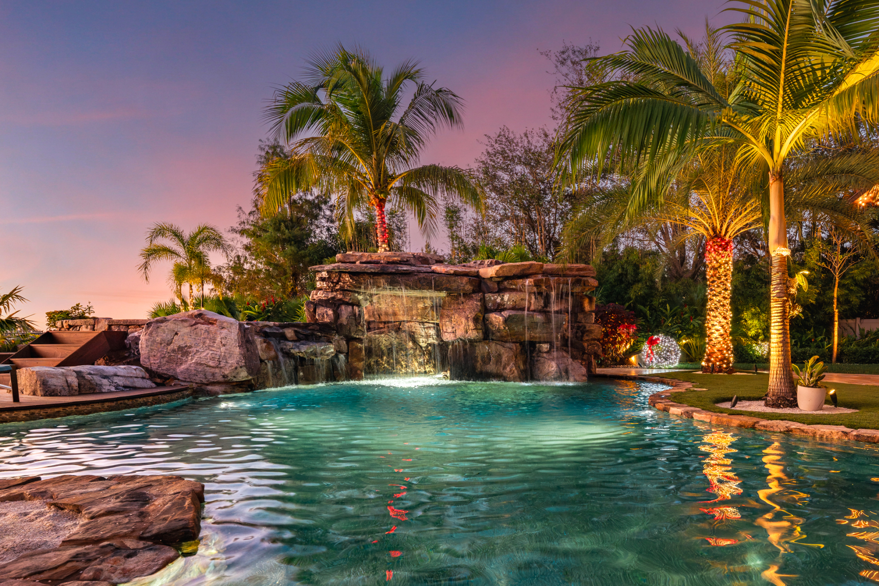 This tropical backyard oasis in Weston, Florida, is one of our favorites! The combination of an Ipe wood deck, natural rock, and lush tropical landscaping creates a timeless paradise that looks like it’s been here forever. We used large, mature specimen plants to give it that instant, established feel, no waiting years for it to grow in
